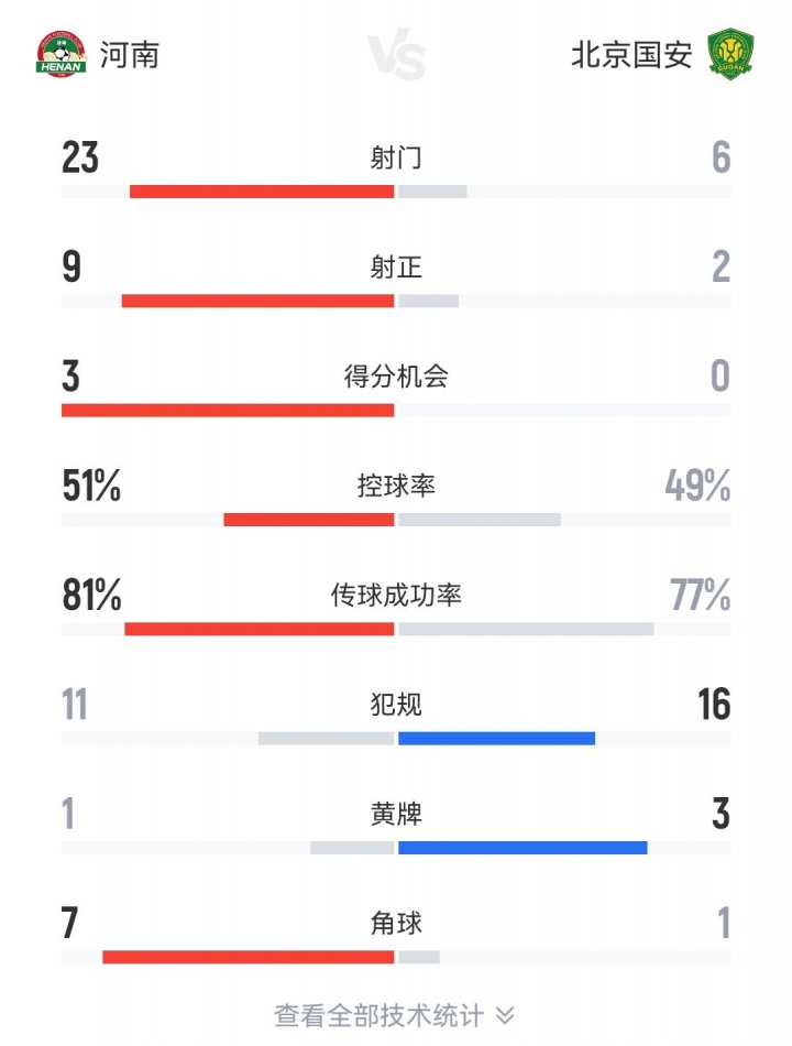 国安上轮以刷新队史的0-6不敌泰山后,本轮面对中超第12的河南队再遭败绩,并且被狂轰23脚射门9射正。